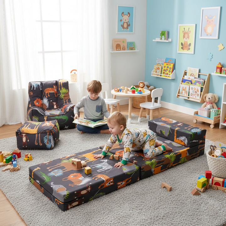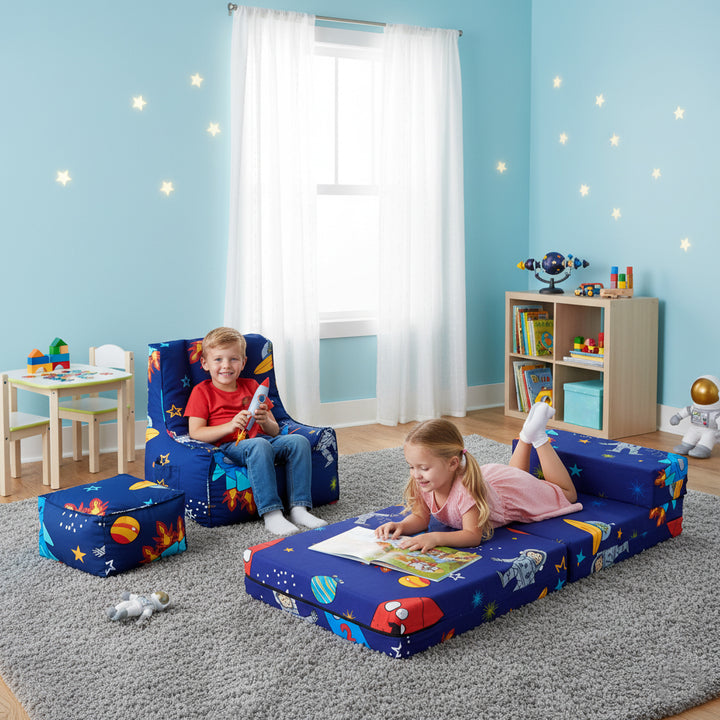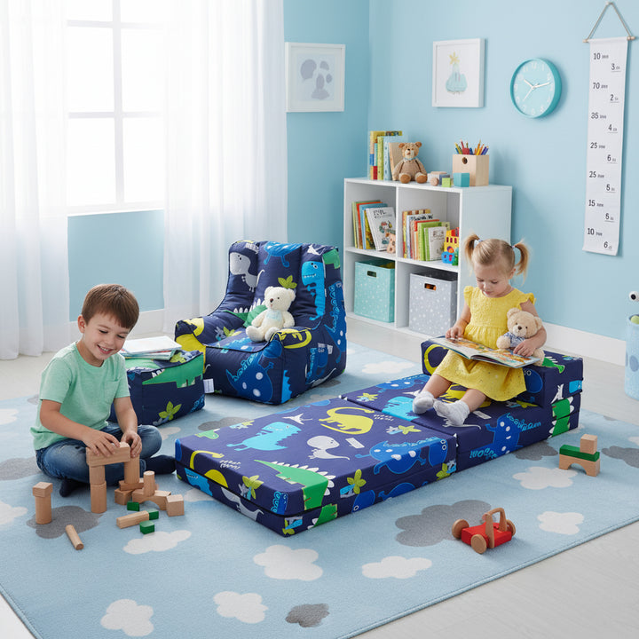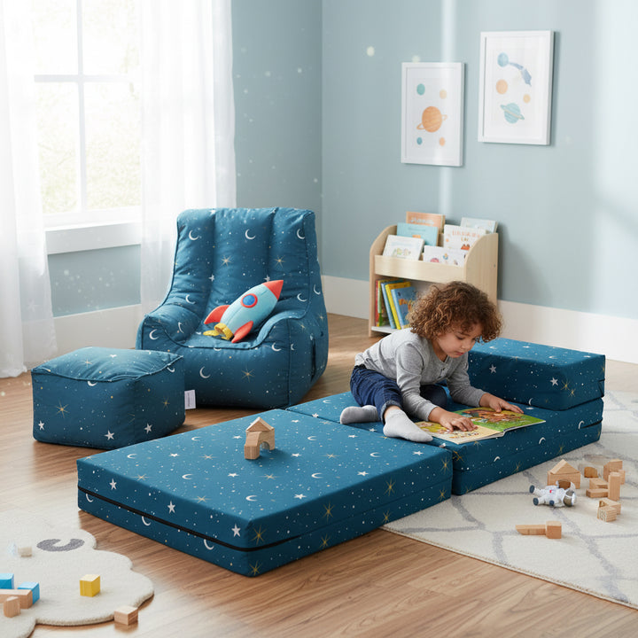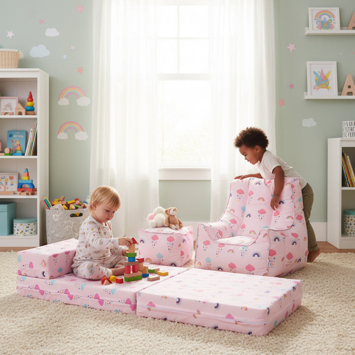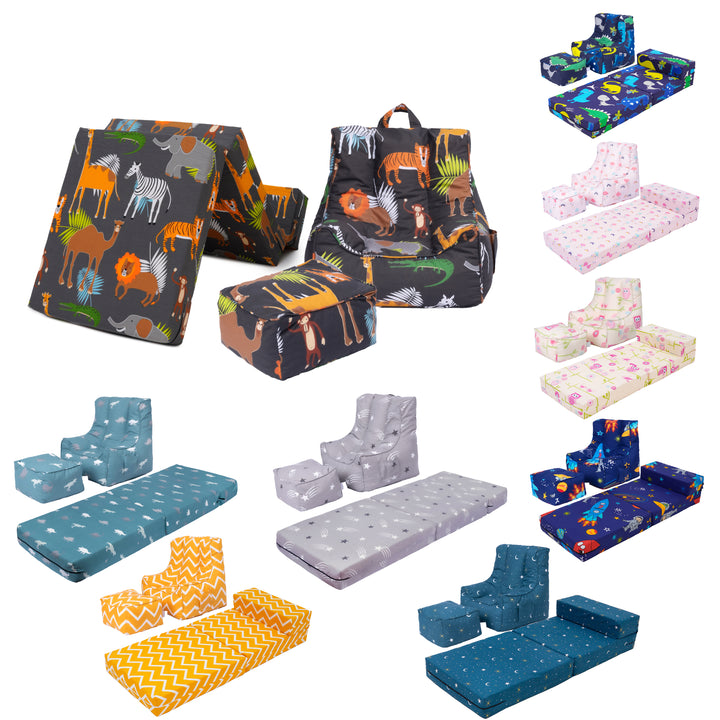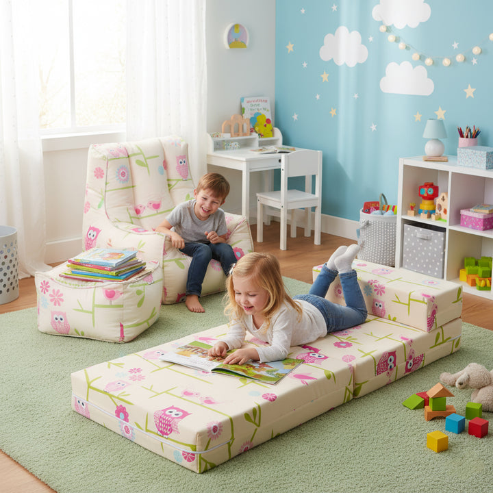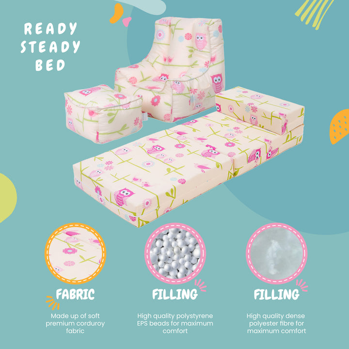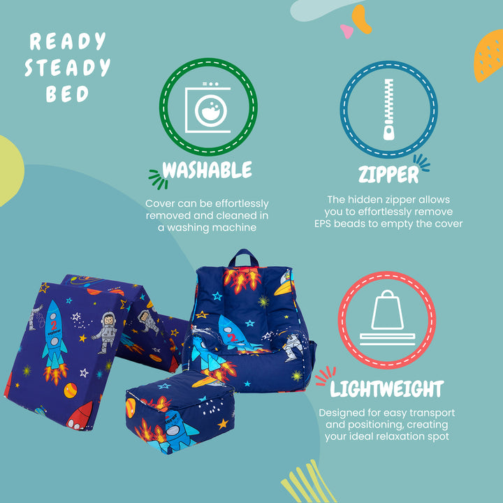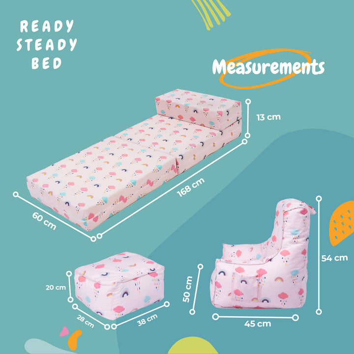 Transform your child’s playroom or bedroom into a cozy and fun space with the Ready Steady Bed Kids Furniture Combo Set, featuring a comfortable bean bag armchair with footstool and a fold-out sofa bed. Designed with both comfort and practicality in mind, this matching set is perfect for reading, lounging, watching TV, or enjoying quiet time.