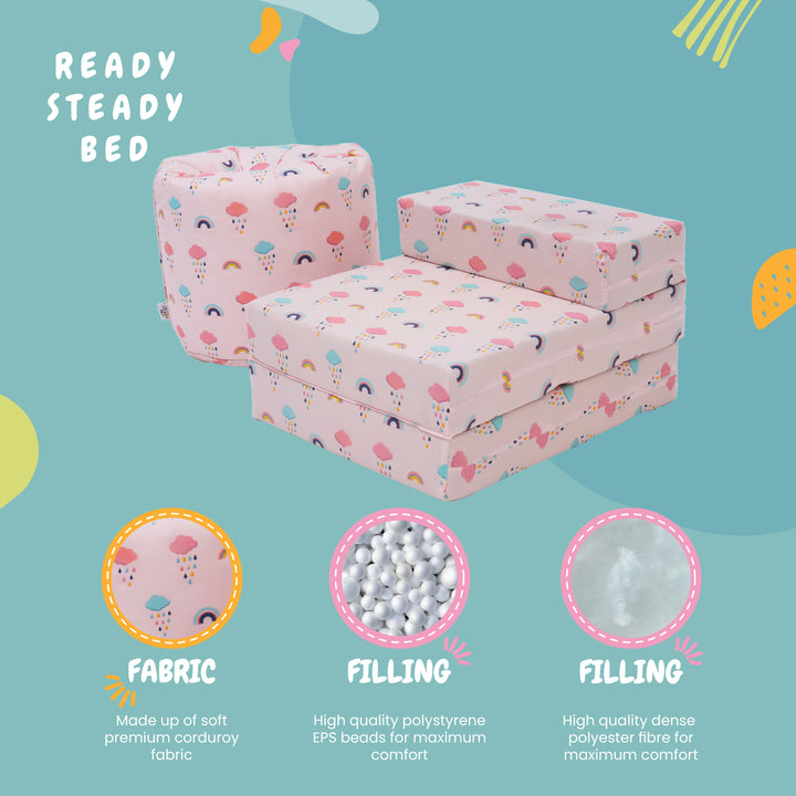 Create a cosy, safe, and fun space for your little one with the Ready Steady Bed Kids Bean Bag Chair and Fold-Out Sofa Bed Combo. Perfect for playrooms, bedrooms, or living rooms, this matching set is designed to offer ultimate comfort, practicality, and child-friendly support.